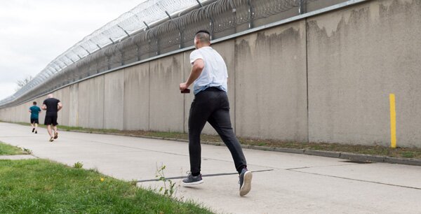 Joanna Zybon entrena a los presos en una carrera de 10 kilómetros en una cárcel de Plötzensee, en Berlín. Foto: Alexander Heinl/DPA