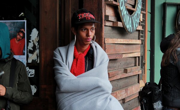 Con la mirada fija en la nada, Griselda, una chica transexual que llegó a Tijuana huyendo de la violencia y discriminación de su país natal, Honduras, intenta cubrirse del frío con una pequeña manta que le prestaron.